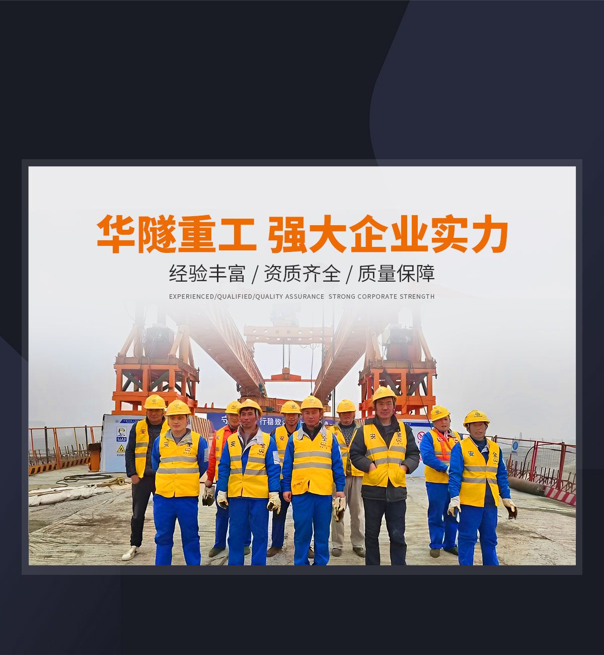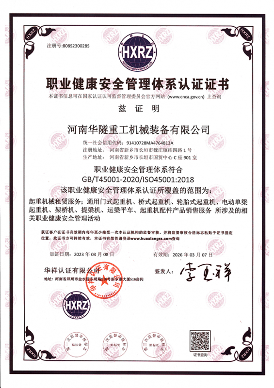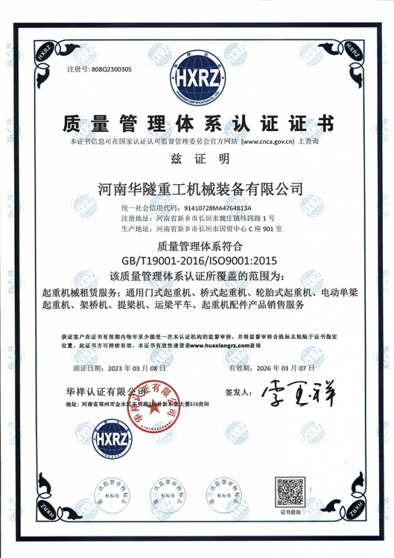 河南華隧重工機械裝備有限公司主要從事通用門式起重機、橋式起重機、電動單梁起重機,輪胎式起重機、架橋機、提梁機、遠梁平車、鋼絲繩電動萌蘆、卷揚機、起重配件制造、銷售:起重機械租賃、安裝和維修,起重設備園收,機械設備維修,鋼結構工程承包,橋梁工程及技術咨淘服務,銷售五金制品、機電設備:建設工程監理,建設工程設計,各類工程建設活動,建筑勞務分包,建筑物折除作業,施工作業,工程管理服務,土石方工程施工,裝如發運?! 」疽淹ㄟ^IS0國際質量、環境、健康與安全三合一標準認證,特種設備制造許可證和特種設備安裝改造維修許可證。擁有完熟的質量管理體系。嚴格的管理制度,強大的生產能力和先進的檢測手段,在保證產品質量的同時,也具備了極強的市場競爭力。  公司堅持科技創新為理念,產品質量為核心,注重信譽,建立了減信可靠、快捷、思速。便利周到的售后服務網絡。  我們擁有的技術專家和技術服務隊伍為客戶提供充善的售前技術支持和全天候的售后服務體系,讓您無后顧之憂,享受一站式的超值服務?!  叭A隧重工,伴您成功“是華隧重工永遠的宗指,真被的希望與各界朋友攜手并進。共創輝準!